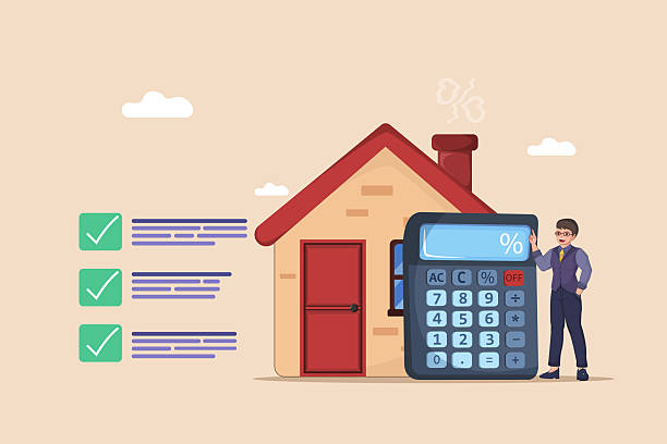 Calculating Property Mortgage and Interest Rates: Man with Calculator Beside a House and Checklist, Representing Real Estate Finance and Investment Planning